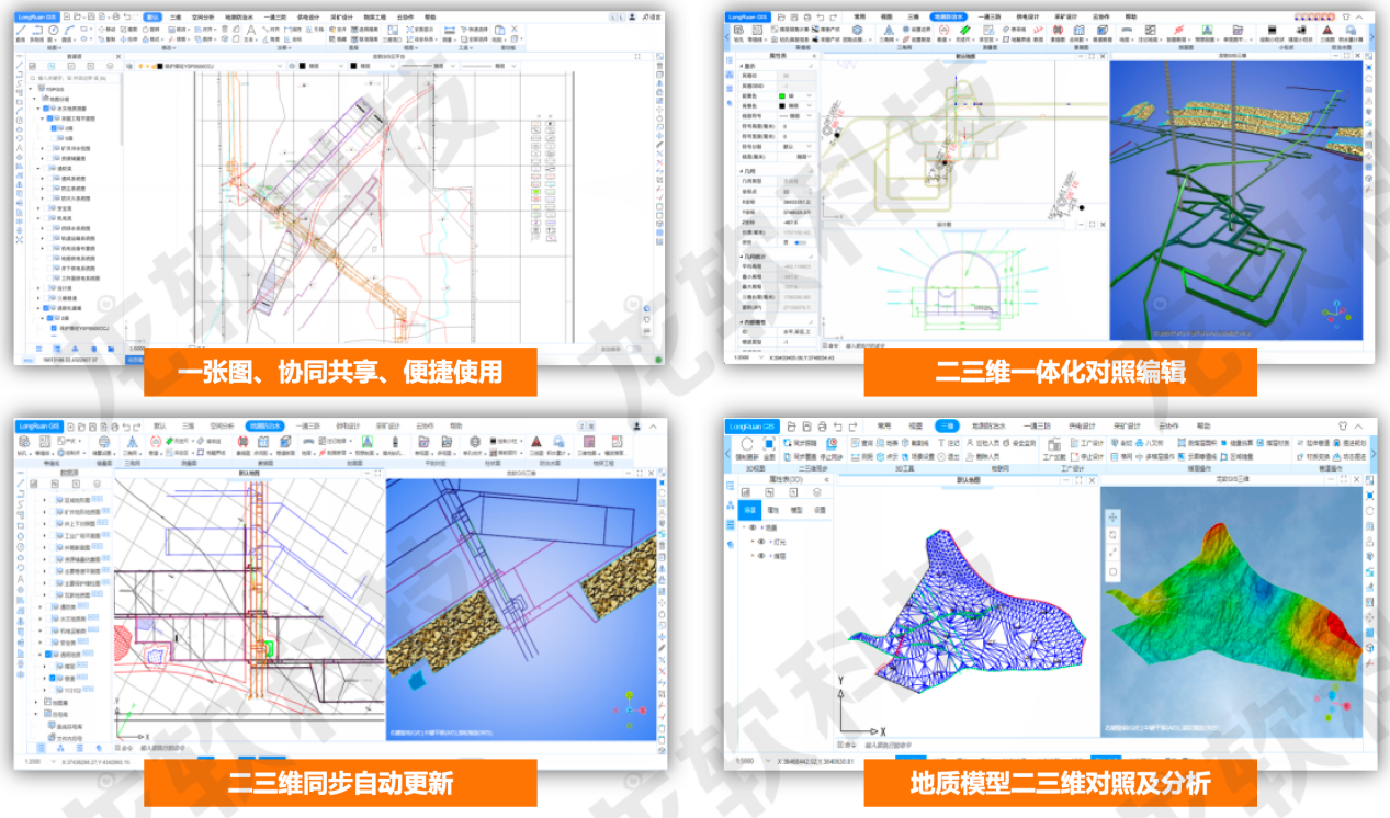 二三維一體化處理:基于云端同源數(shù)據(jù),提供同屏、雙向同步的二維、三維一體化應用,自動構(gòu)建礦山巷道、煤層、構(gòu)造、鉆孔等各類三維模型,提供二三維同步跟隨、對照編輯、自動更新等便捷應用。