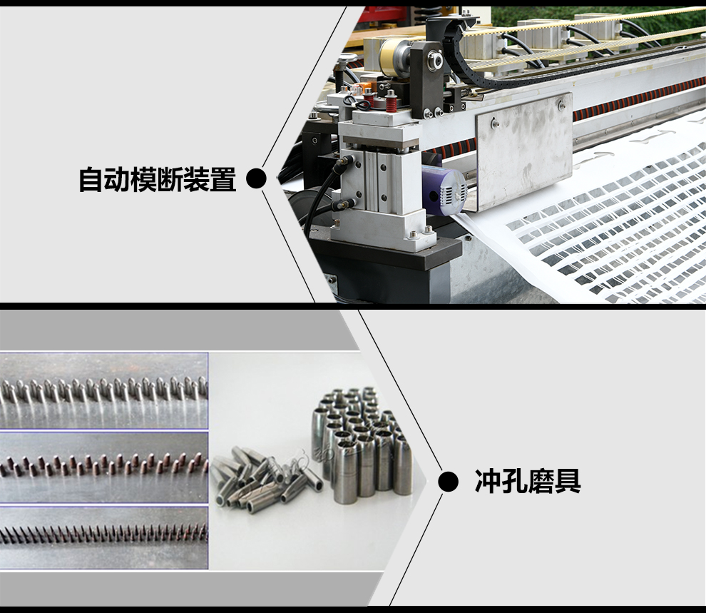 8. 沖孔模具:?jiǎn)蝹€(gè)花樣沖仔組合成模型,并且沖仔可單個(gè)維修